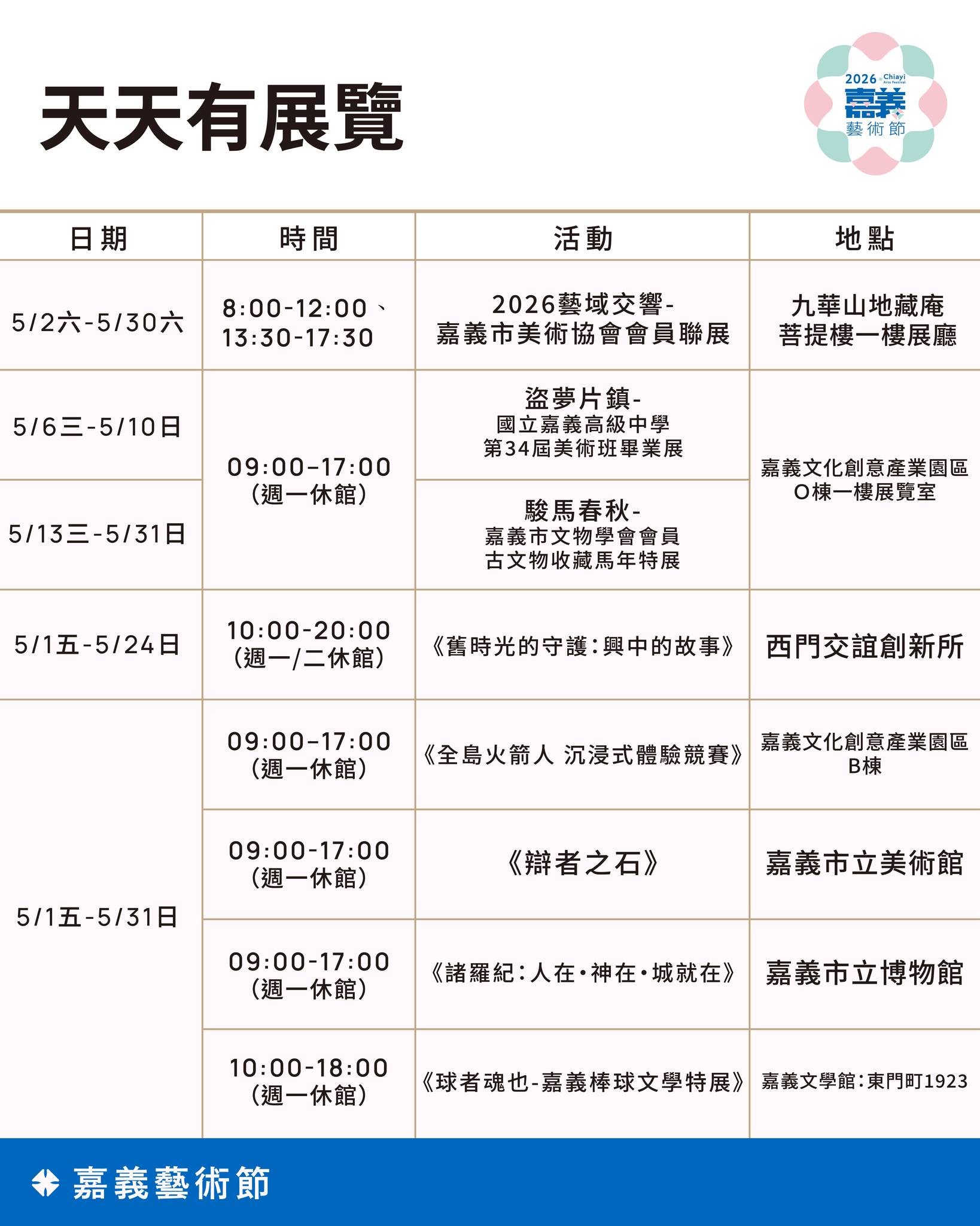 不同主題展覽同步展開,包括嘉義市立美術館、嘉義市立博物館、嘉義文學館:東門町1923及西門交誼創新所等等,讓文化藝術深入城市不同角落。