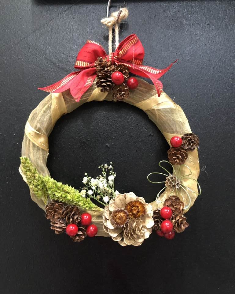 2. 材料:真藤花圈、乾燥花果種子、鋁線、其他飾物等