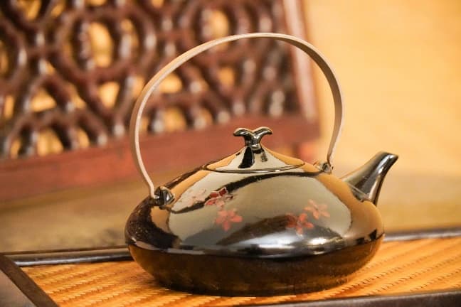 ?梅花提樑壺|瓷提樑壺上黑漆,貼上鮮花,再上生漆、梨地固定之,古樸典雅流暢壺身圓融飽滿
